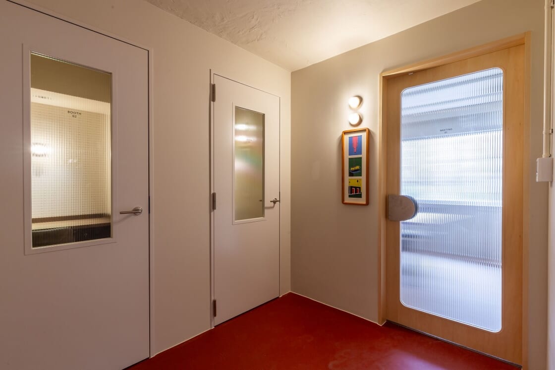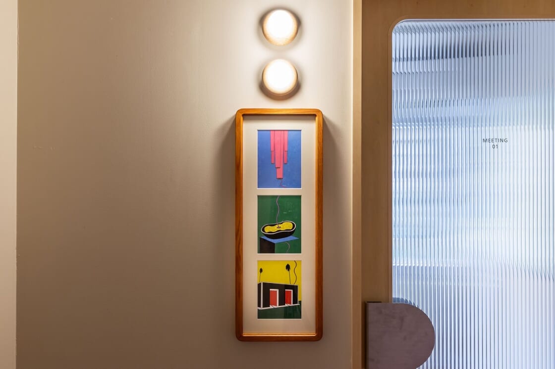 2階のミーティングルームのアートについては、自分自身が会議とかで緊張しやすいタイプなので、緊張しいな人が、ミーティングに出るときに緊張が和らぐようラフに描くことを意識しました。 3枚のアートが連なっているのですが、糸で緊張を表現し、その最後の着地が家なんですが、家に帰ったら緊張が和らぐ。だからもう少しの辛抱だよ、という気持ちを表現しました。
