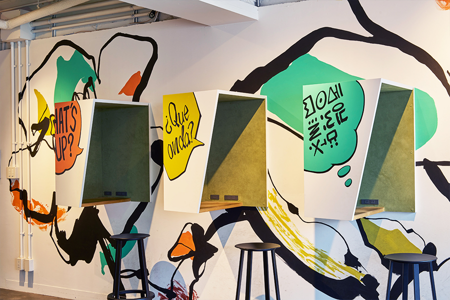 3つのPHONEブースは一人用作業スペースだったので、吹き出しを入れ、何気ない会話から世界が繋がる様子を表現しました。