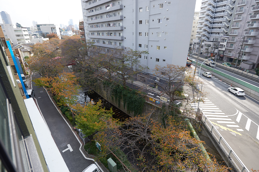 そして建物に入った時の空気感、ここから眺める目黒川の景色です。