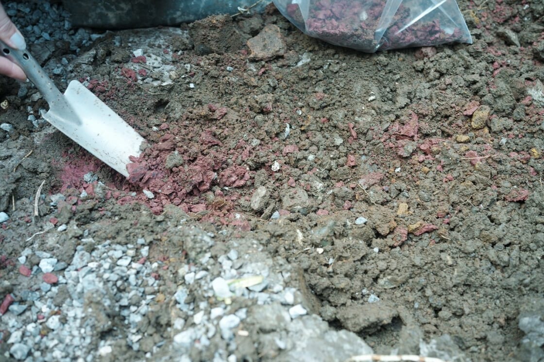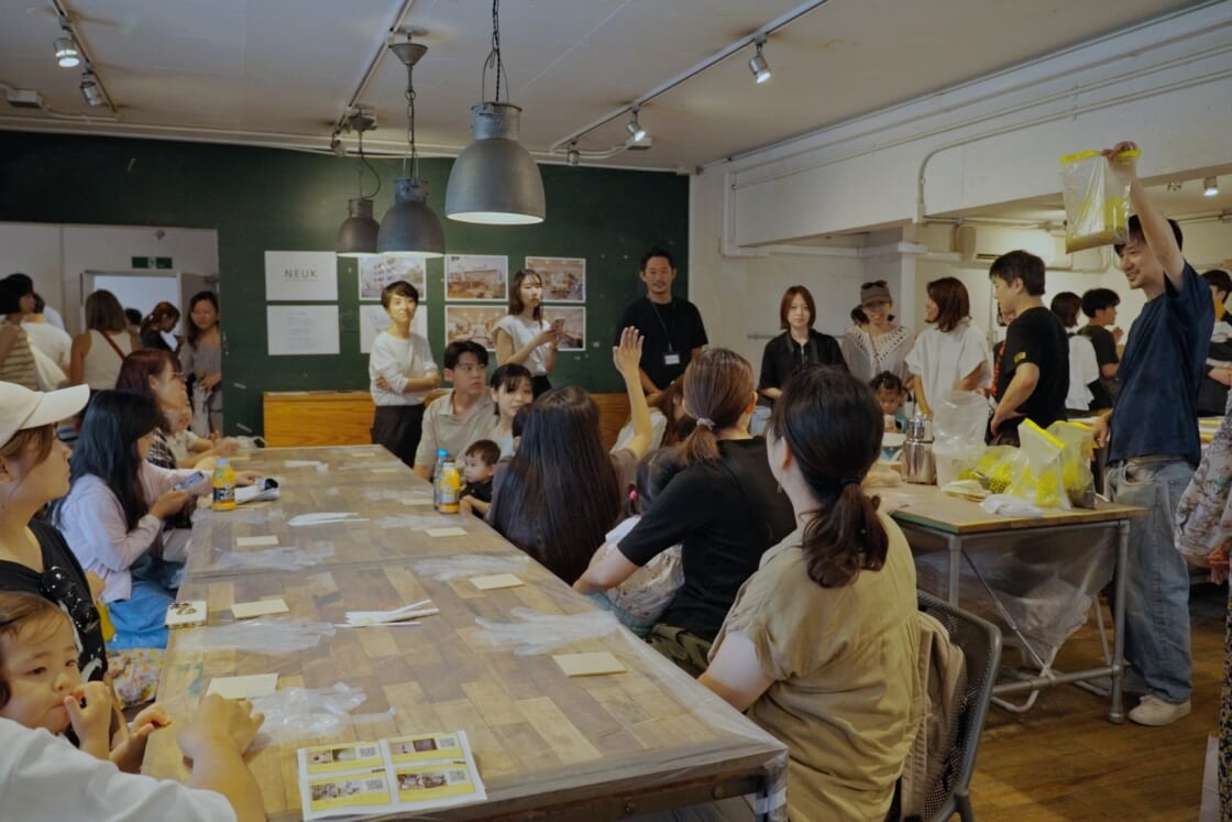 塗料化する素材集めをみんなでやった時間ですね。皆さん楽しそうに取り組んでくれていて、スペースデザインを手がけてくださったデザイン事務所「CLOCK」の皆さんも、「久しぶりに土を触った!」と、童心に帰ったかのように楽しそうに参加してくれました。また、ワークショップで子どもたちが真剣な表情で制作してくれている姿を見た時も、大きな喜びを感じました。