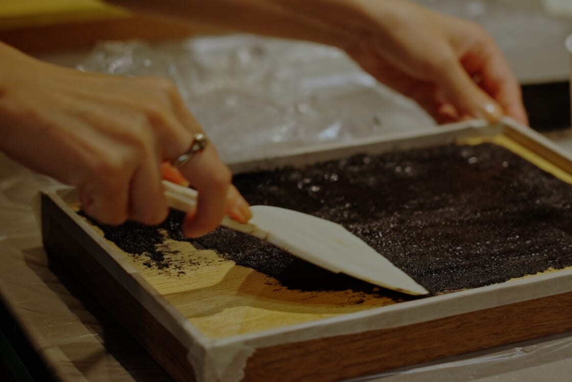 その活動の中で、廃材や古材活用に関する様々なアイデアを模索し続けてきました。古道具のアップサイクルや、空き家の持つ記憶を未来へ繋ぐ方法など、たくさんのトライアルを実施した中で生まれたアイデアの一つが、「廃材を含む未利用資源を塗料化する」というものでした。特殊塗装の専門家との出会いがあり、共に試行錯誤を繰り返した後に、現在の「NULL」の原型が出来てきたという経緯です。会社(YTRO DESIGN INSTITUTE)の事業内容との相性も良かったので、これを本格的なプロジェクトにしようと思い、廃材などの未利用資源を”色“として顕在化させることをきっかけにモノづくりのあり方をデザインする「NULL」が誕生しました。