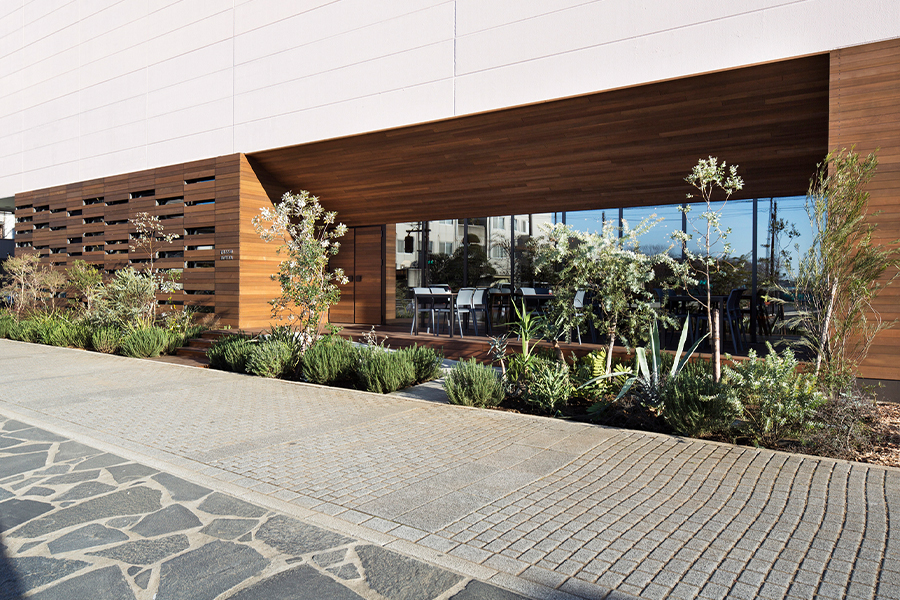 時間によって表情が変わる角度のついた木のルーバーで2階レベルを構成、表通りに対しては1階既存外壁ラインをセットバックさせ、植栽や内部にあった柱を外部化し、デザインのポイントとすることで表通りの雰囲気を醸成しています。木のルーバーは角度や一見ランダムにみえる配置も、既存サッシ枠を隠す配置にするなど検証を重ねて決定しました。