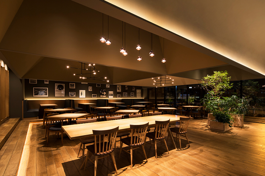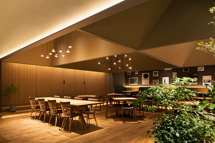 ダイニングスペースを天井形によって分設しながら大人数のイベントにも対応できるように、ワンルームの空間として計画したレストランです。各天井形の照明もそれぞれで調整できるようにしています。
