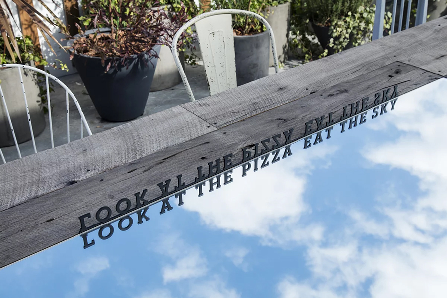 ピザ屋のフードトラックとイートインをデザインしたプロジェクトです。ピザを焼くシェフや商品を受け取るお客さまの姿が街の風景となるように、遊び心をちりばめたデザインになっています。食卓で空の移ろいを楽しめるように、屋外テラスのテーブルにミラーをはめ込みました。