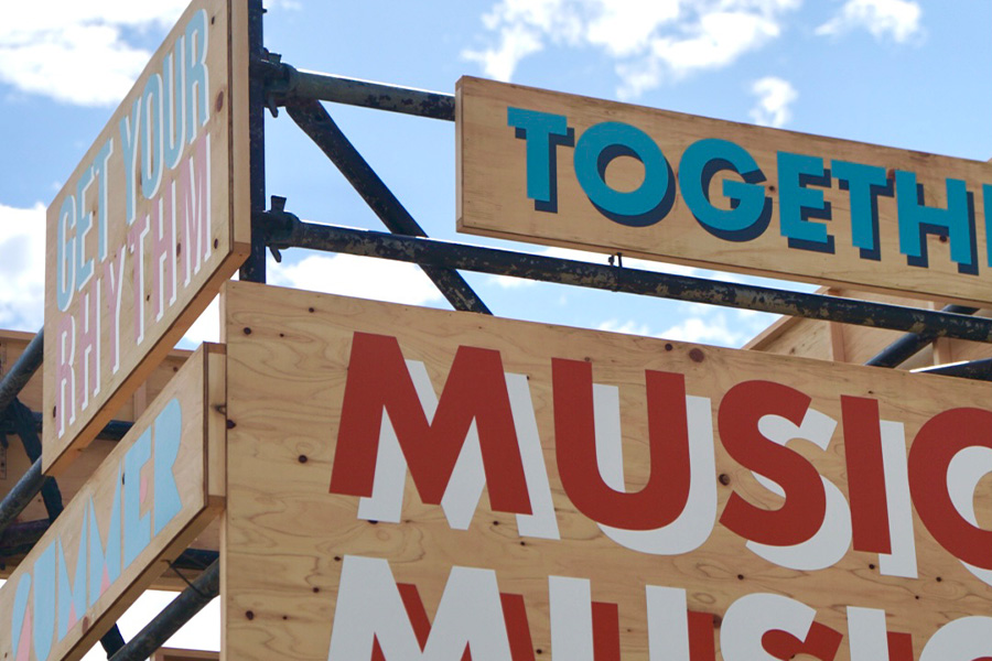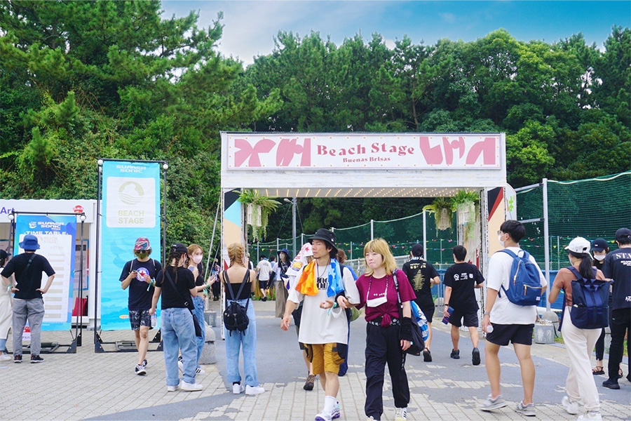 2022年8月に千葉県幕張で開催されたSUMMER SONIC 2022 のBeach Stageエリア全体のグラフィックデザイン、空間デザイン、クリエイティブ・ディレクションを担当。椰子の木をモチーフにしたキービジュアルをイベントロゴとは別に制作。明るいオレンジ色をキーカラーとし、会場全体にこのKVを配置することで統一感を出した。ZOZOマリンや幕張メッセから向かってくる人を様々なメッセージが描かれたゲートや壁画がお出迎え。エリア奥に見えるステージ両サイドバナーや、会場のパネルが空間の印象を明るくし、非日常感のある場所へと誘います。
