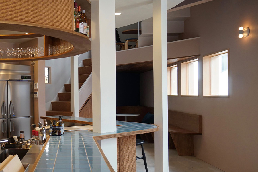 1階も同じ考えでカクテルスタンドを作りました。これもオーストラリアに行ったときに見つけたスタンドからインスピレーションを受けています。みんなですごく感動したお店で、いつかこういうのをやりたいよね、と話していました。