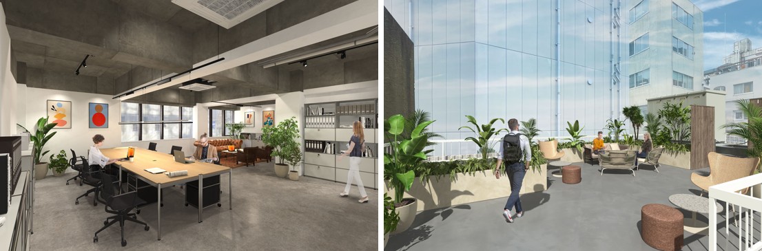 共用の会議室・フォンブース、開放感のある屋上テラスも完備しており、専有部にとどまらない多様な働き方をサポート。神南の街に馴染む、機能的で洗練されたワークプレイスを提供します。