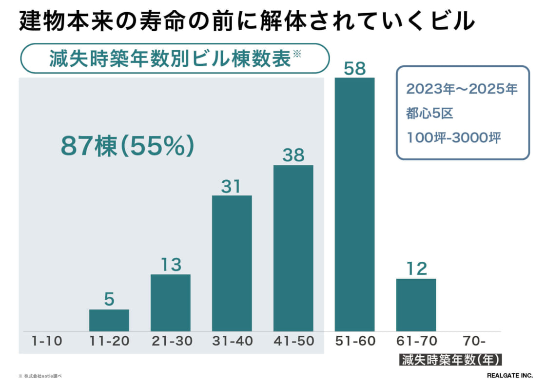 2.建物の短寿命化による環境負荷増大への対応:建物の骨組みであるコンクリートは本来100年程度の寿命があると言われていますが、当社の調査では、東京都心部の商業ビルのうち、実に55%が法定耐用年数(50年)を満たさずに解体されているという深刻な実態が明らかになりました。