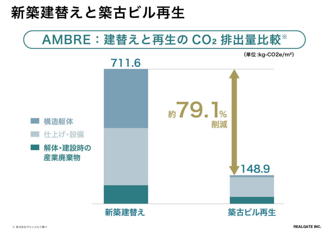 本来であればあと数十年は現役でいられるはずの良質なビルが寿命の半分で解体され、また新たなビルに建て替わる現状は、建設時に多くの資源とエネルギーを消費するため、地球温暖化問題の観点からも大きな課題となっています。建物をゼロから建てる新築開発と比較して、既存ビルの構造体を維持したまま再生する手法は、建設段階における二酸化炭素(CO2)排出量を削減することが可能です。当社物件を基にした試算によれば同規模・同用途の新築開発と比較して、約79%の削減が可能であるとの結論を得ました。
