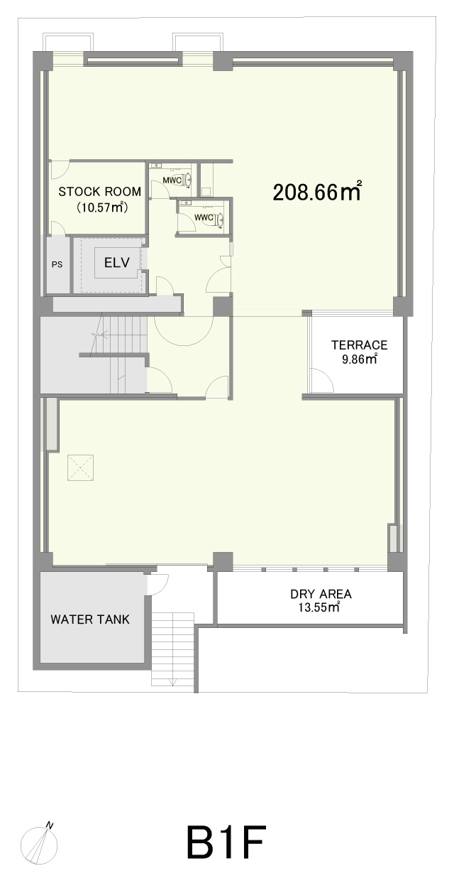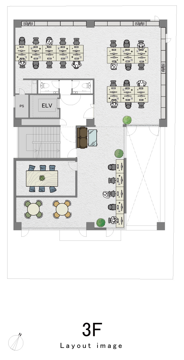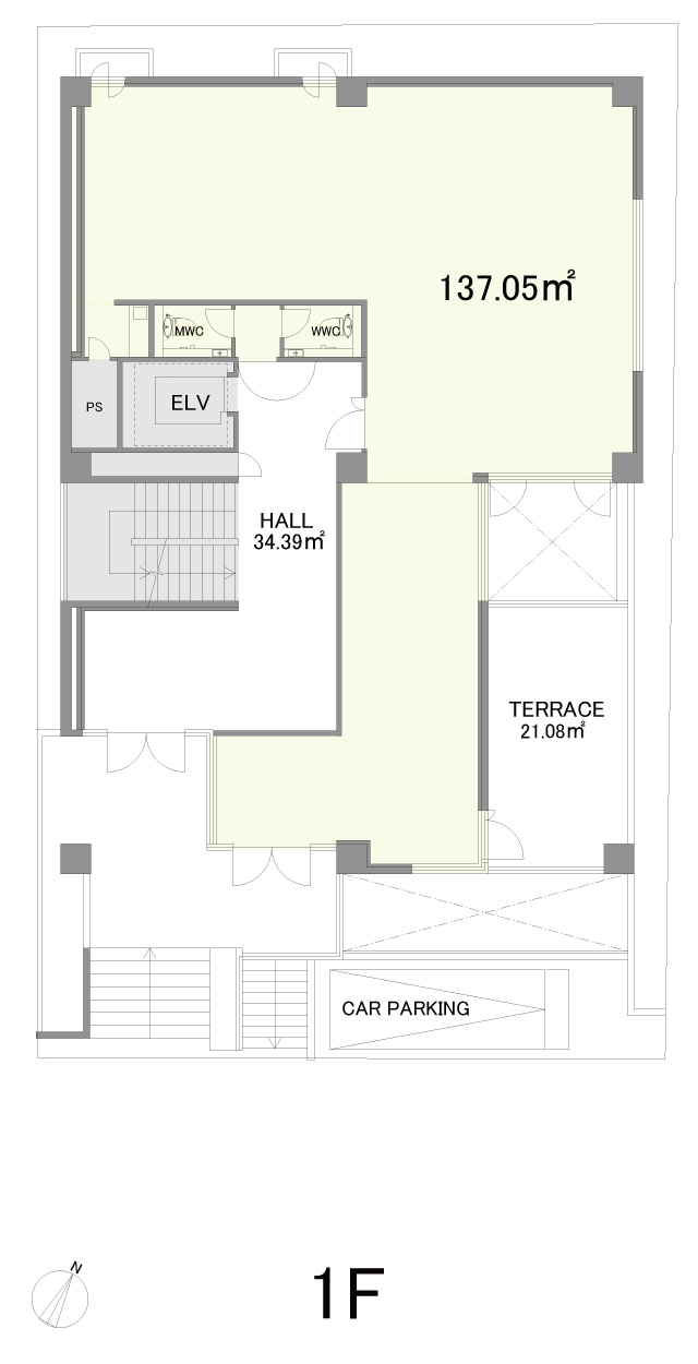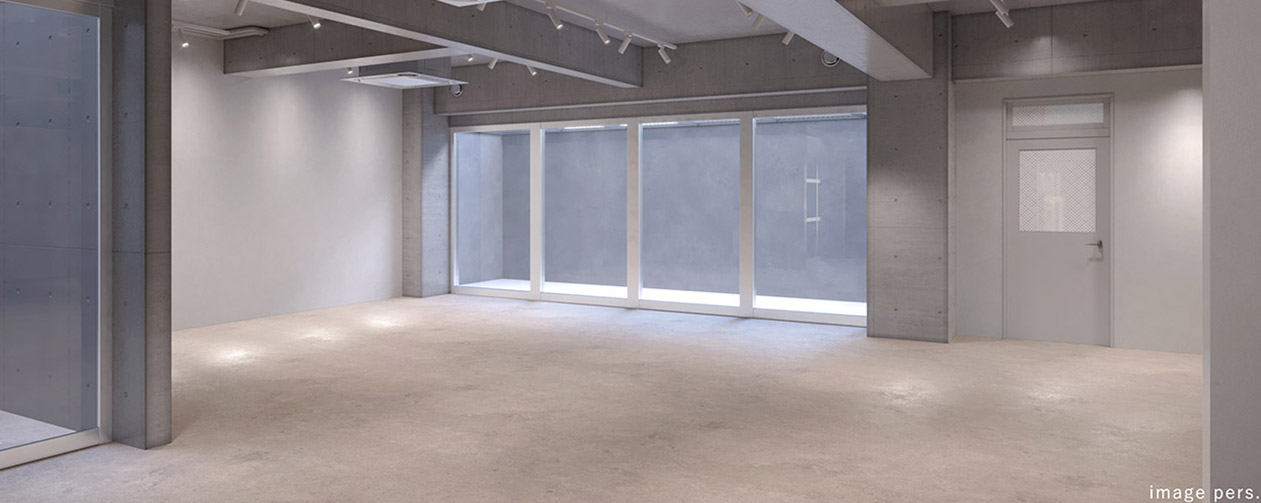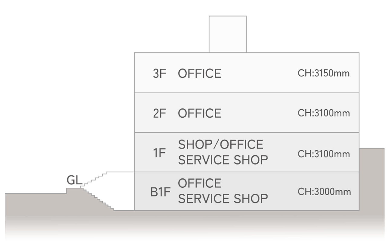 B1Fは前面道路からの直導線があり、サービス店舗、事務所の利用が可能。2F-3Fは、事務所用途で、ショールームや撮影スタジオと兼用も可能。
