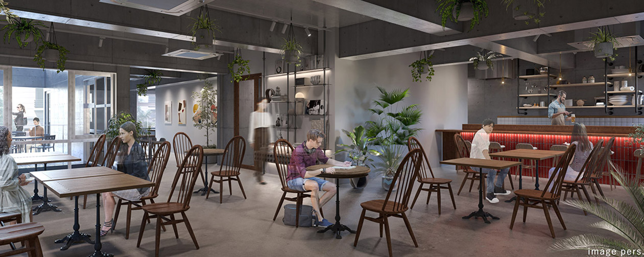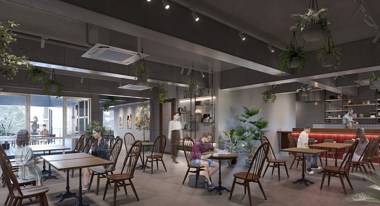 オフィスだけでなく、1Fは店舗、サービス店舗、事務所と複数用途で使用でき、飲食店も入居可能。